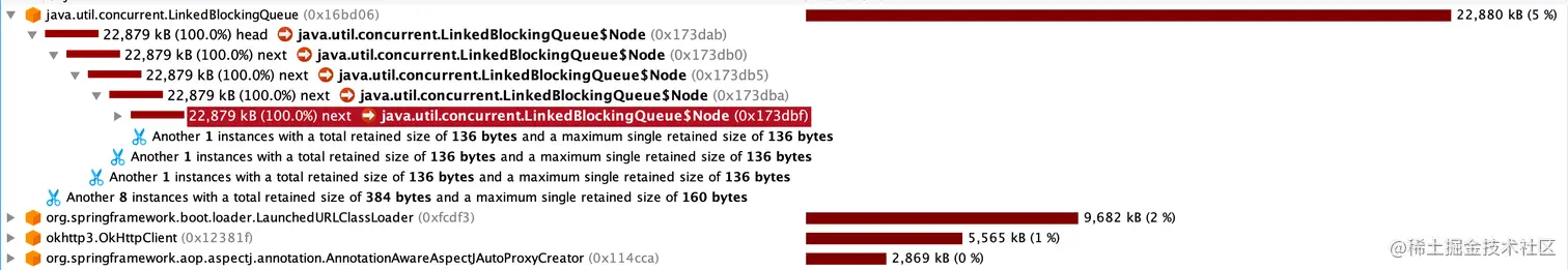 那为什么还是会一直拉取消息呢?巧就巧在这个流控逻辑对于多线程消费的场景是失效的,当提交到ProcessQueue的消息处理请求每次都会被提交到线程池去处理,哪怕线程池处理不了也会丢到队列中去执行,所以就会导致ProcessQueue无法满足消息条数与内存量的大小阈值,从而避开流控,但由于监听器方法处理是需要耗时的,在大流量下处理时间越来越高,但是提交到线程池中(阻塞队列)这就造成了阻塞的无界队列无限变大,在本地复现了之后可以看到整个线程池的等待队列中有几万的消费处理请求,其中每个消费请求都持有了MessageExt对象,当然此时已把内存消耗完了。