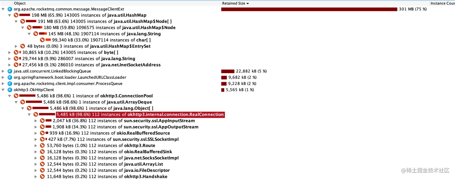 通过jprofiler查看堆栈文件,可以看到为有大量的MessageClientExt对象呢?此时还是一脸懵x的,为什么会有这么多对象未被回收?我们初步判断是拉取了大量的mq消息,导致了本地的消息堆积造成的。