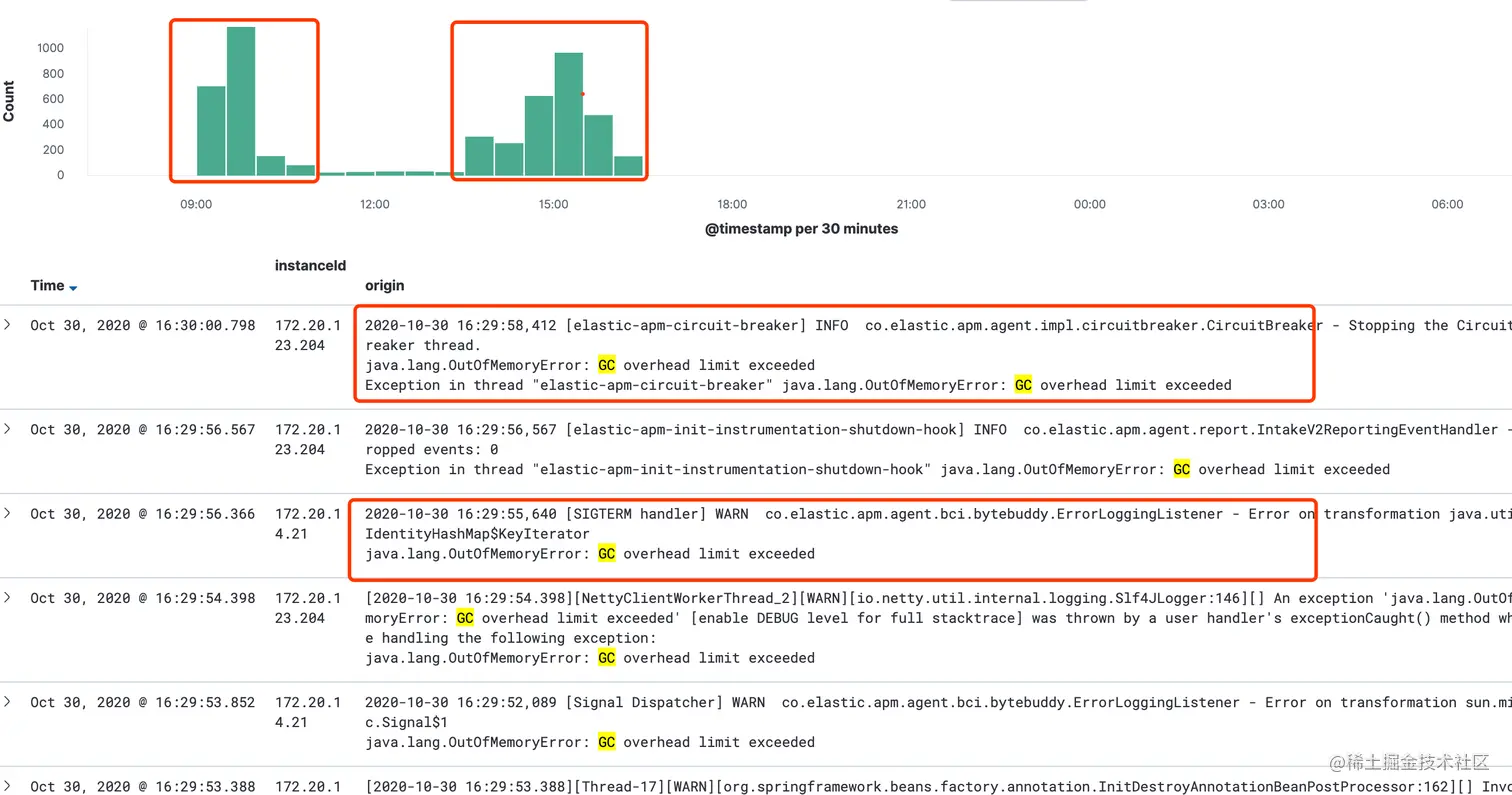 由于有些接口性能实在太烂,在优化了一波接口后,我们对这个服务进行了重新上线,但是一上线,**就炸了!就炸了!**总共进行了两次上线9点和14点的时候各上了一次线,一更新服务后就出现了oom情况,在第一次oom后,我们查看了业务代码觉得是由于转发的数据量太大导致的oom,于是增加jvm的内存,发现并没有什么用。这就非常诡异了。