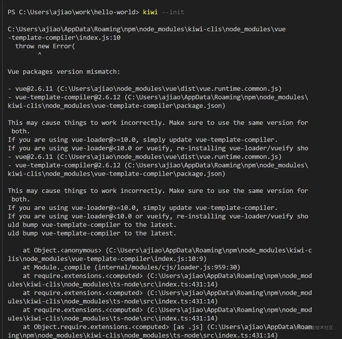 有了提示之后,我开始按照kiwi-cli上的文档介绍,想使用一下它的命令行,结果发现执行了kiwi-init之后, 项目报错了。