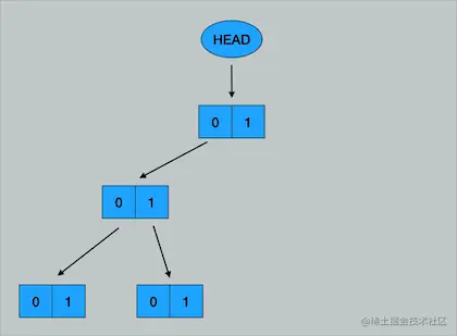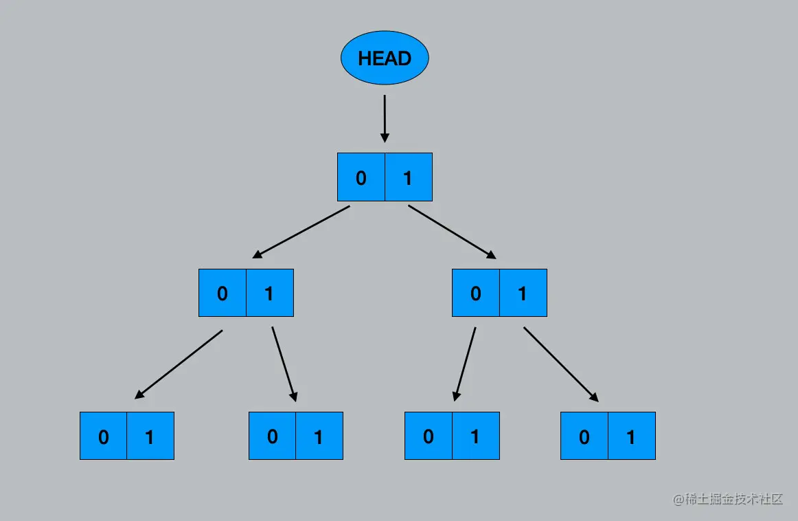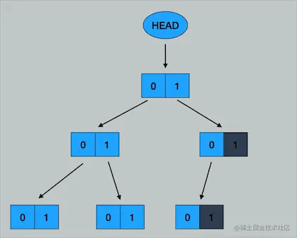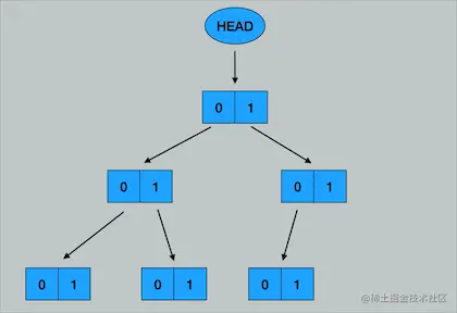 与数字分区对应的是位分区,这个位就是 bit,当数字分区中每个节点的存储量是 2 的指数次方的时候,我们就得到了一颗位分区的前缀树,比如一颗最简单的位分区前缀树就是二进制的: