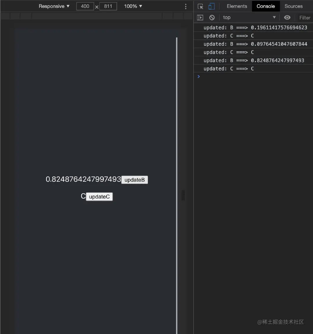 上面有两个子组件和一个父组件,点击对应的 button 可以更新对应的子属性,但是点击 button 之后,可以看到另一个组件即使数据没有发生变化,也会进行 rerender。