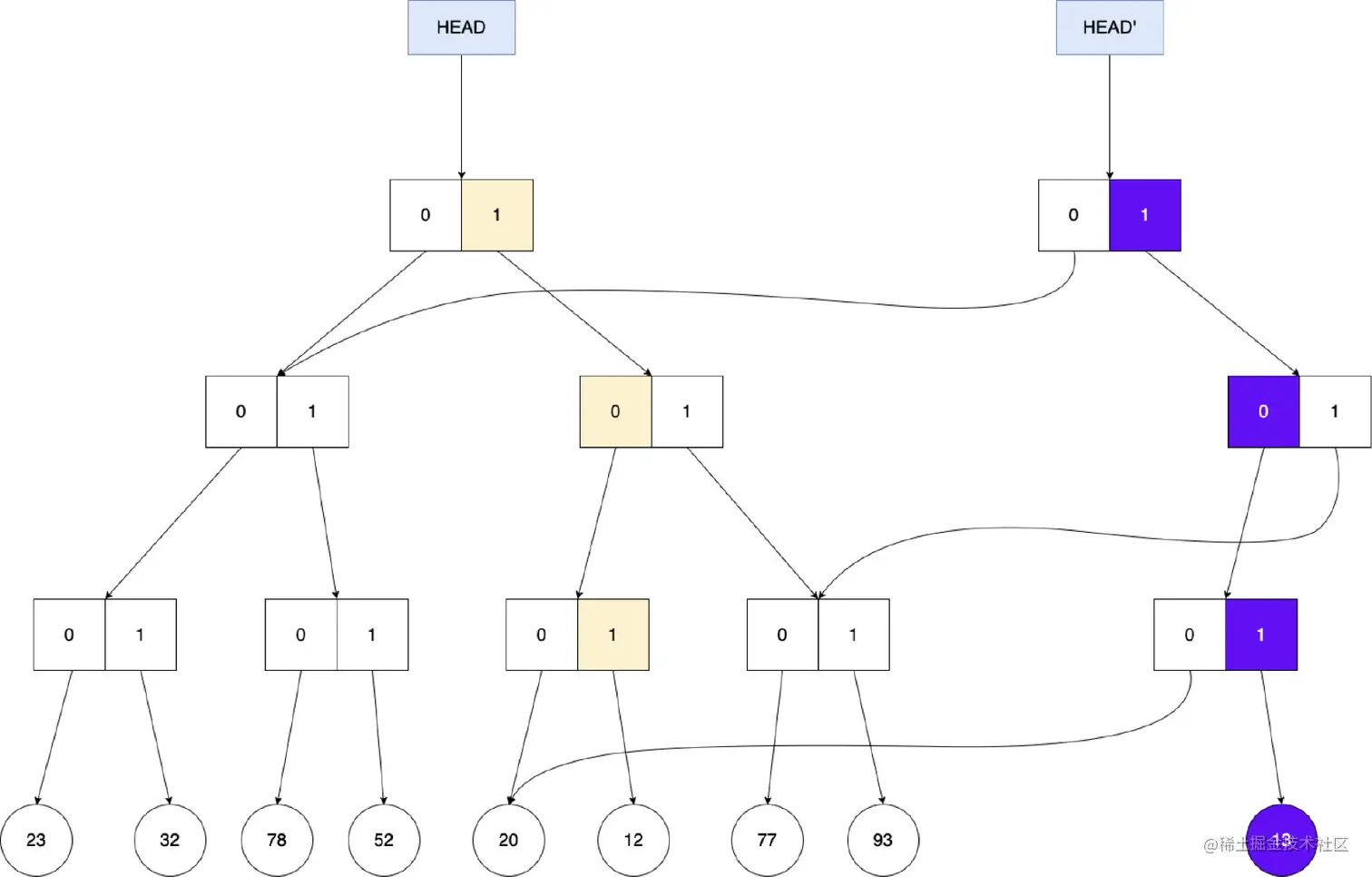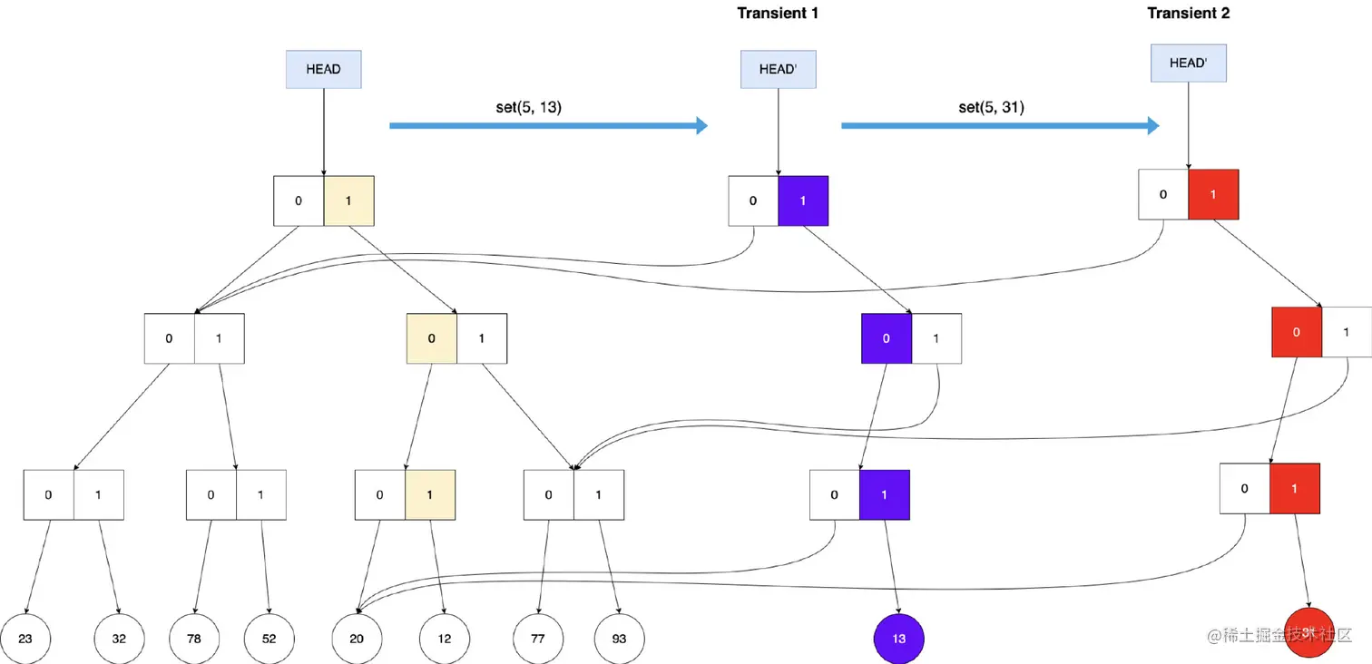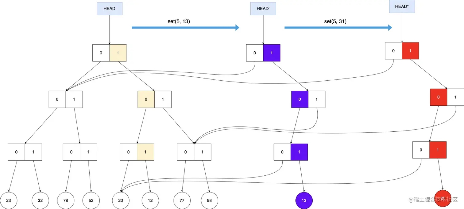 每次修改树的结构,我们都会拷贝索引路径上的所有节点,而旁系节点则维持原来的引用不变,这样就实现了数据结构的持久化。我们每次设置都可以得到一个全新的树结构,但是对于未修改的节点,引用未发生变化,所以看起来就实现了数据结构的共享。