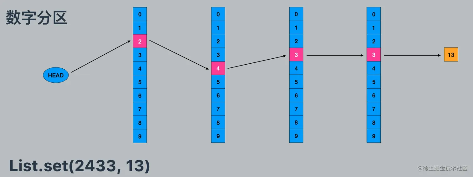 上图表示了将这个前缀树作为一个 list,并将 list 的 2433 位置设置为 13 的过程,我们很快的就能够得到每层索引的计算公式如下: