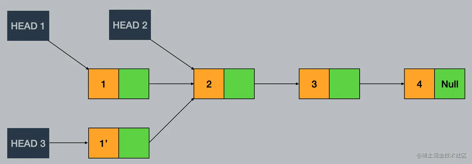 如果我们要将 HEAD3 链表移除 2 节点,只需要复制 1‘ 节点,然后将其指向 3 节点,并且创建新的 HEAD4 头指针指向复制后的 1’‘ 节点。