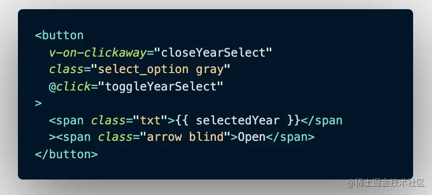 想象一下,我有一个完整的选择框,其中包含 li 元素列表(此处未显示)。上面的按钮用于触发我的自定义选择框项目列表,当我在该元素外点击时,会触发一个关闭选项列表的方法。这比强迫用户始终单击元素右上角处的“X”按钮要好得多。我们只需将以下内容添加到按钮即可获得此功能: v-on-clickaway = "closeMethodName"。
