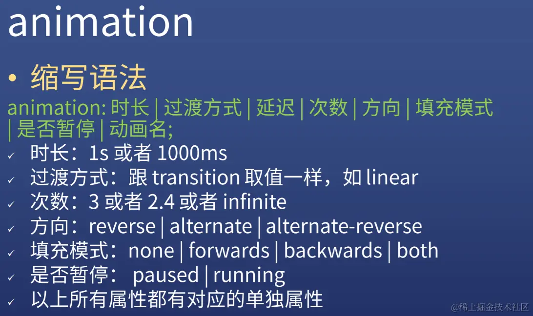 顾名思义,就是过渡,能够设置一个元素从一个位置到另一个位置的过渡,持续时间、延迟、拉伸,旋转等等变化,能够减少浏览器的渲染,节约资源