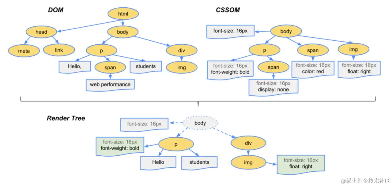 - 将两棵树合并成一棵渲染树(render tree