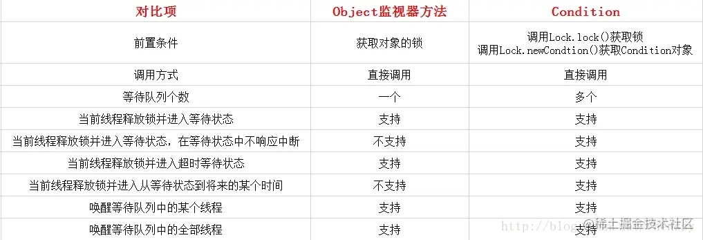 在没有 Lock 之前,我们使用 synchronized 来控制同步,配合 Object 的 #wait()、#notify() 等一系列方法可以实现等待 / 通知模式。在 Java SE 5 后,Java 提供了 Lock 接口,相对于 synchronized 而言,Lock 提供了条件 Condition ,对线程的等待、唤醒操作更加详细和灵活。下图是 Condition 与 Object 的监视器方法的对比(摘自《Java并发编程的艺术》):