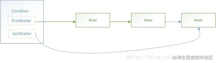 firstWaiter),尾节点(lastWaiter)。当前线程调用#await()方法时,将会以当前线程构造成一个节点(Node),并将节点加入到该队列的尾部。结构如下: -