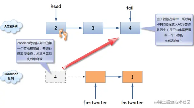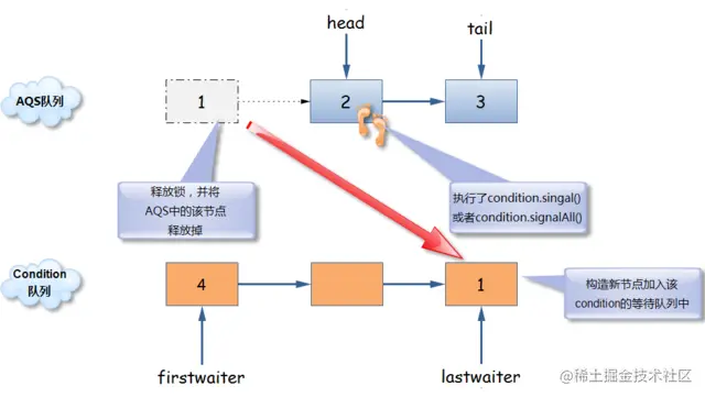 - 唤醒首节点是先将条件队列中的头节点移出,然后调用 AQS 的
