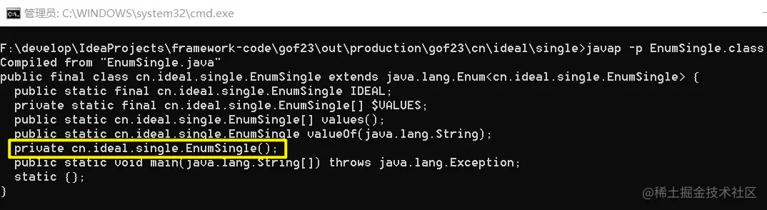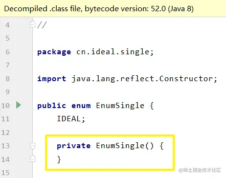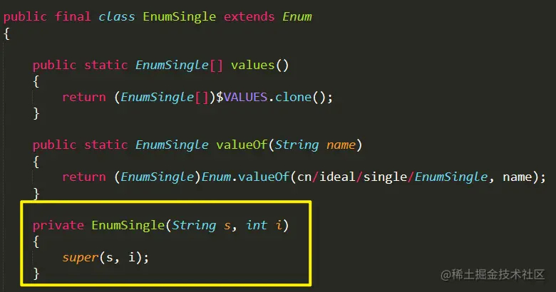 看一下我们枚举单例类 EnumSingle 生成的字节码文件,可以看到其中有一个无参构造,也就是说,我们还是只需要拿到 getDeclaredConstructor(null) 就行了