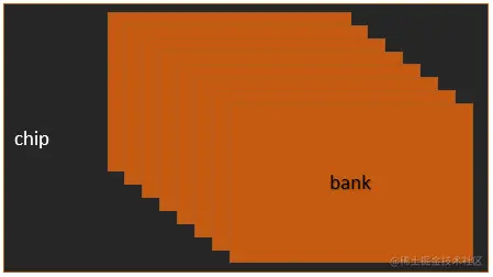 内存是由chip构成。每个chip内部,是由8个bank组成的。其构造如下图: