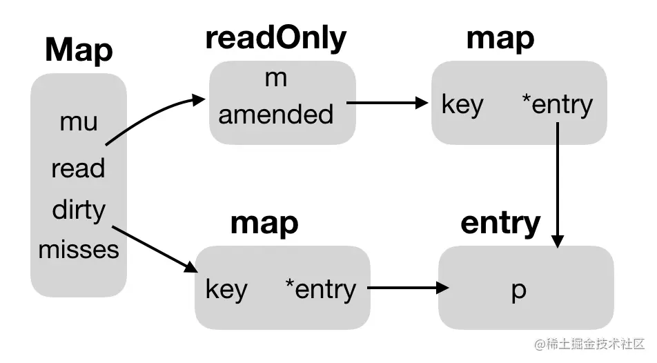 如下所示,map中有read(读)和dirty(写)两种,操作dirty的时候需要加锁,misses用来记录从dirty读的次数,当超过一定次数后dirty中的数据会同步到read中。read中有amended字段来标识同一条记录read中没有dirty中有的情况。expunge代表dirty中被删掉的情况。