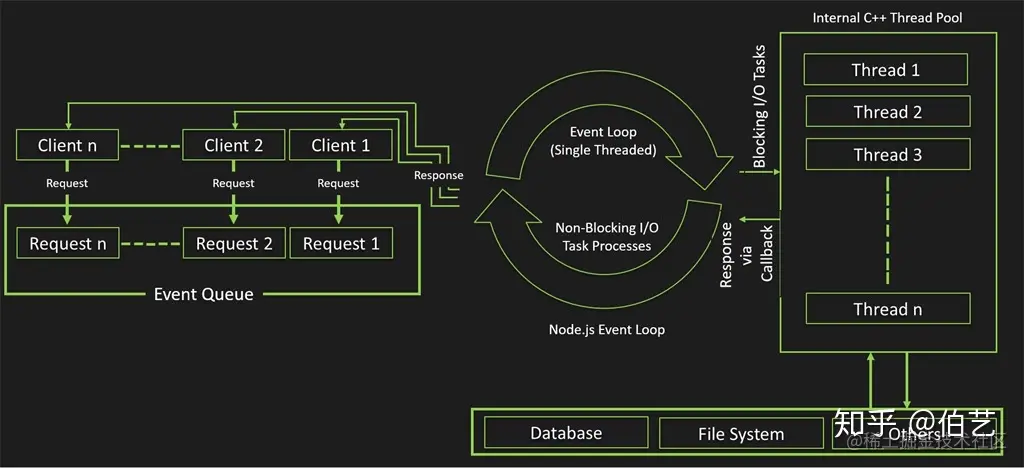 - Client 请求到达 node api,该请求被添加到Event Queue(事件队列)。这是因为Node.js 无法同时处理多个请求。
