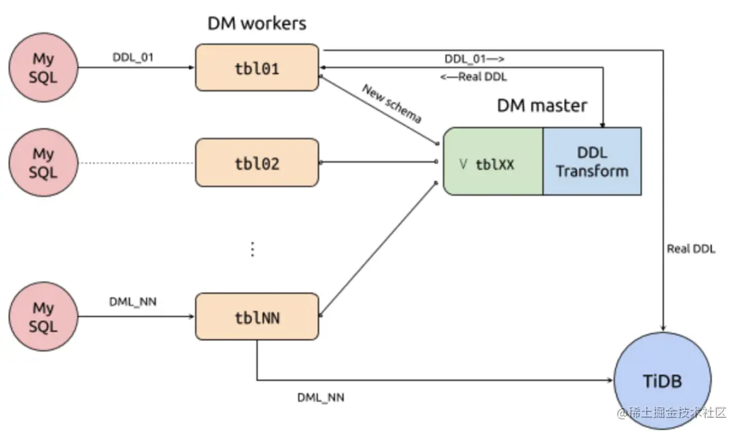 在乐观协调模式下,DM-worker 接收到来自上游的 DDL 后,会把更新后的表结构转送给 DM-master。DM-worker 会追踪各分表当前的表结构,DM-master 合并成可兼容来自每个分表 DML 的合成结构,然后通知相应的 DM-worker 把与此对应的 DDL 迁移到下游;对于 DML 会直接迁移到下游。