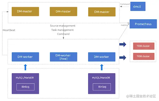 当部署多个 DM-master 节点时,所有 DM-master 节点将使用内部嵌入的 etcd 组成集群。该 DM-master 集群用于存储集群节点信息、任务配置等元数据,同时通过 etcd 选举出 leader 节点,该 leader 节点用于提供集群管理、数据迁移任务管理相关的各类服务。若可用的 DM-master 节点数超过部署节点的半数,即可正常提供服务。