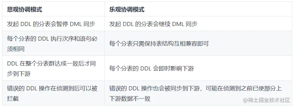 DM 1.0 版本支持在线上执行分库分表的 DDL 语句(通称 Sharding DDL),通过使用悲观模式,即当上游一个分表执行某一 DDL 后,这个分表的迁移会暂停,等待其他所有分表都执行了同样的 DDL 才在下游执行该 DDL 并继续数据迁移。悲观协调模式的优点是可以保证迁移到下游的数据不会出错,缺点是会暂停数据迁移而不利于对上游进行灰度变更、并显著地增加增量数据复制的延迟。