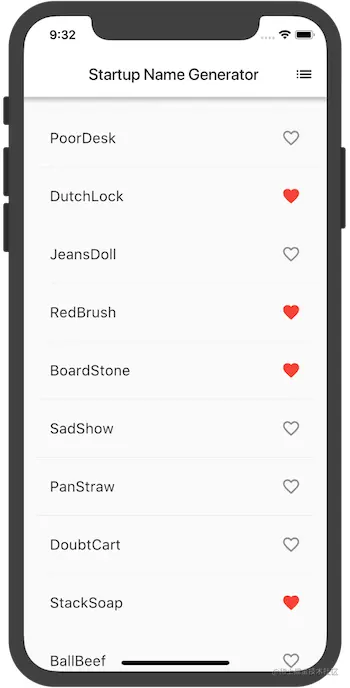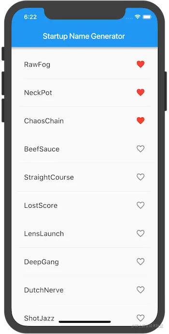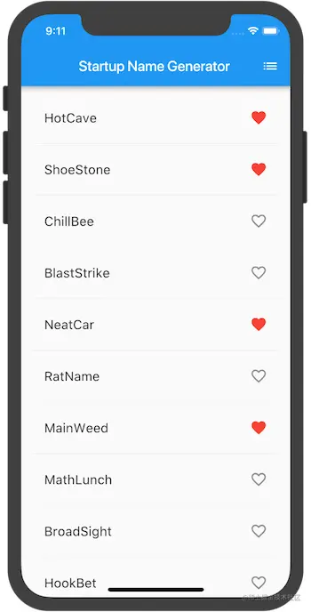 提示: 在Flutter的响应式风格的框架中,调用setState() 会为State对象触发build()方法,从而导致对UI的更新 热重载你的应用。你就可以点击任何一行收藏或移除。请注意,点击一行时会生成从心形 ❤️ 图标发出的水波动画.