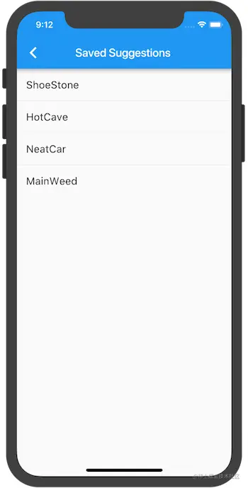 5.热重载应用程序。收藏一些选项,并点击应用栏中的列表图标,在新路由页面中显示收藏的内容。 请注意,导航器会在应用栏中添加一个“返回”按钮。你不必显式实现Navigator.pop。点击后退按钮返回到主页路由。
