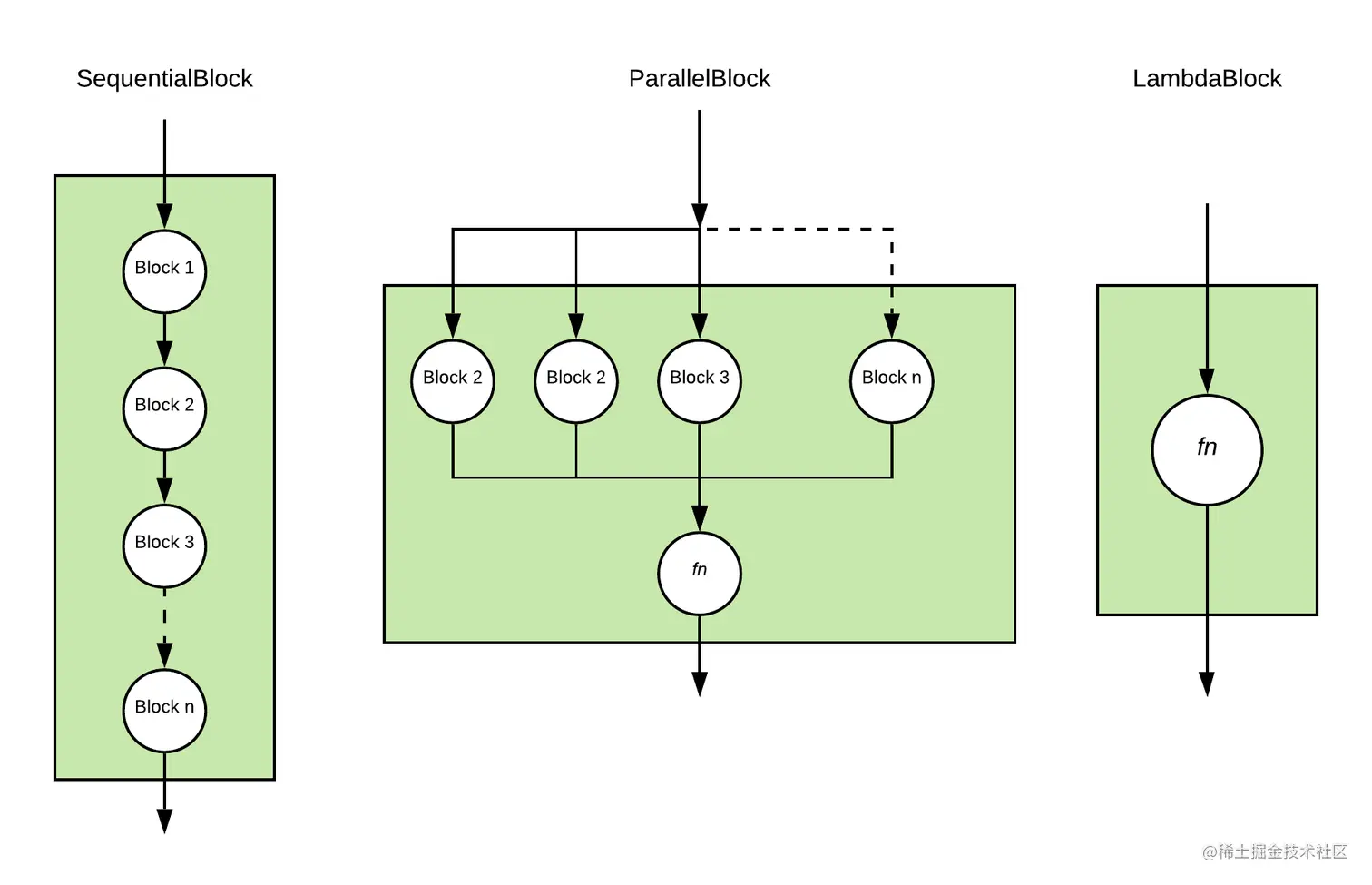 根据几种基本的神经网络工作模式,我们提供了几种 Block 的变体。SequentialBlock 是为了应对顺序执行每一个子 Block 构造而成的。它会将前一个子 Block 的输出作为下一个 Block 的输入 继续执行到底。与之对应的,是 ParallelBlock 它用于将一个输入并行输入到每一个子 Block 中,同时将输出结果根据特定的合并方程合并起来。最后我们说一下 LambdaBlock,它是帮助用户进行快速操作的一个 Block,其中并不具备任何参数,所以也没有任何部分在训练过程中更新。