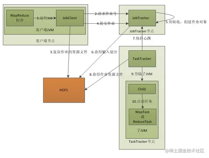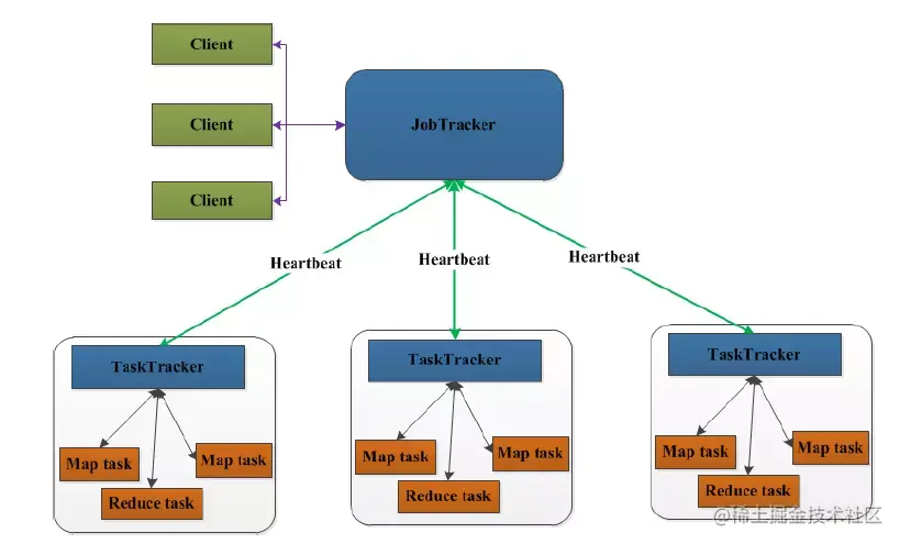 客户端向JobTracker提交一个作业,JobTracker把这个作业拆分成很多份,然后分配给TaskTracker去执行,TaskTracker会隔一段时间向JobTracker发送(Heartbeat)心跳信息,如果JobTracker在一段时间内没有收到TaskTracker的心跳信息,JobTracker会认为TaskTracker挂掉了,会把TaskTracker的作业任务分配给其他TaskTracker。