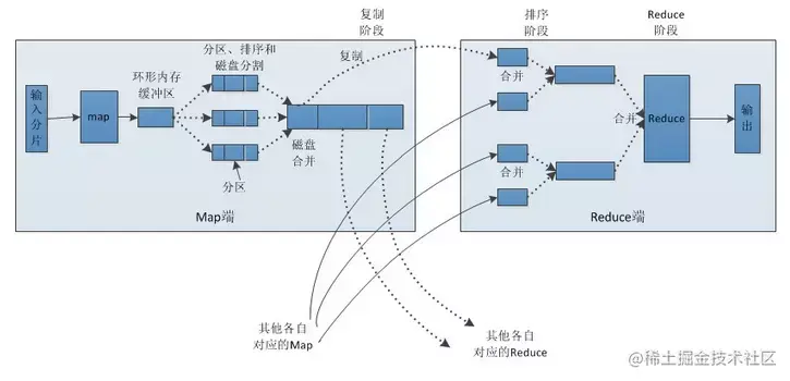 (1)多个map任务的输出,按照不同的分区,通过网络copy到不同的reduce节点上。(shuffle)