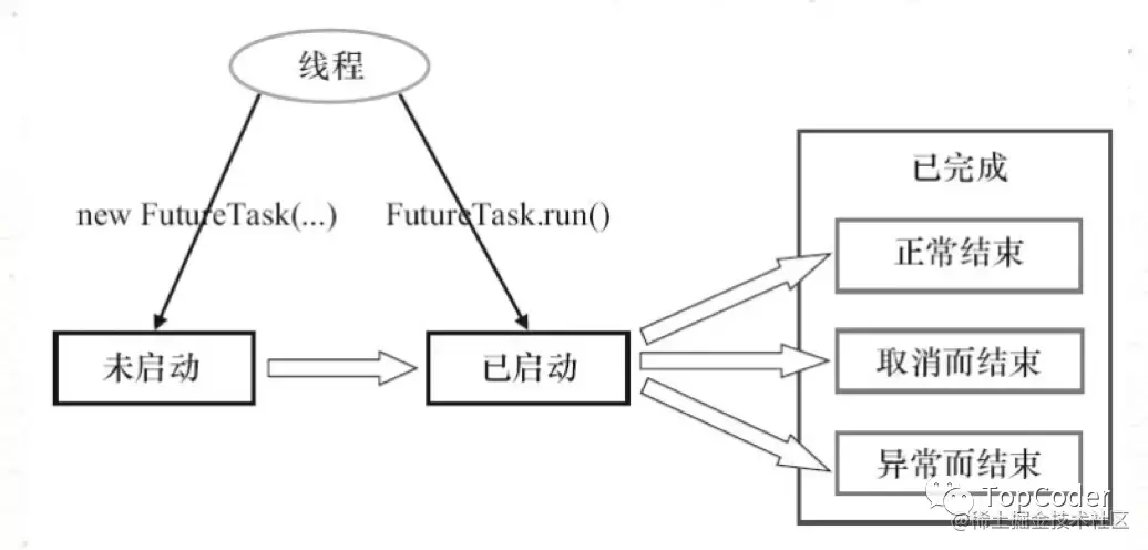 FutureTask除了实现Future接口外,还实现了Runnable接口。因此,FutureTask可以交给Executor执行,也可以由调用线程直接执行(FutureTask.run())。根据FutureTask.run()方法被执行的时机,FutureTask可以处于以下3种状态:未启动、运行中、已完成。