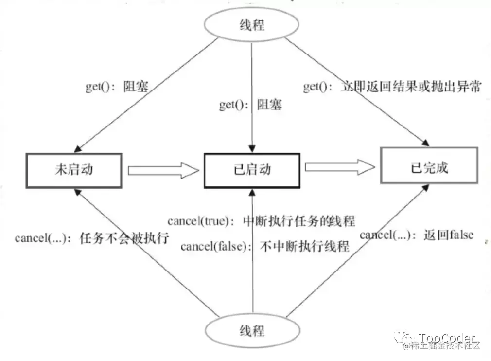 执行future.get()时,如果对应线程还未执行完,则会阻塞当前线程,以FutureTask为例,FutureTask中有一个int型的状态标志,表示future对应线程的运行状态。