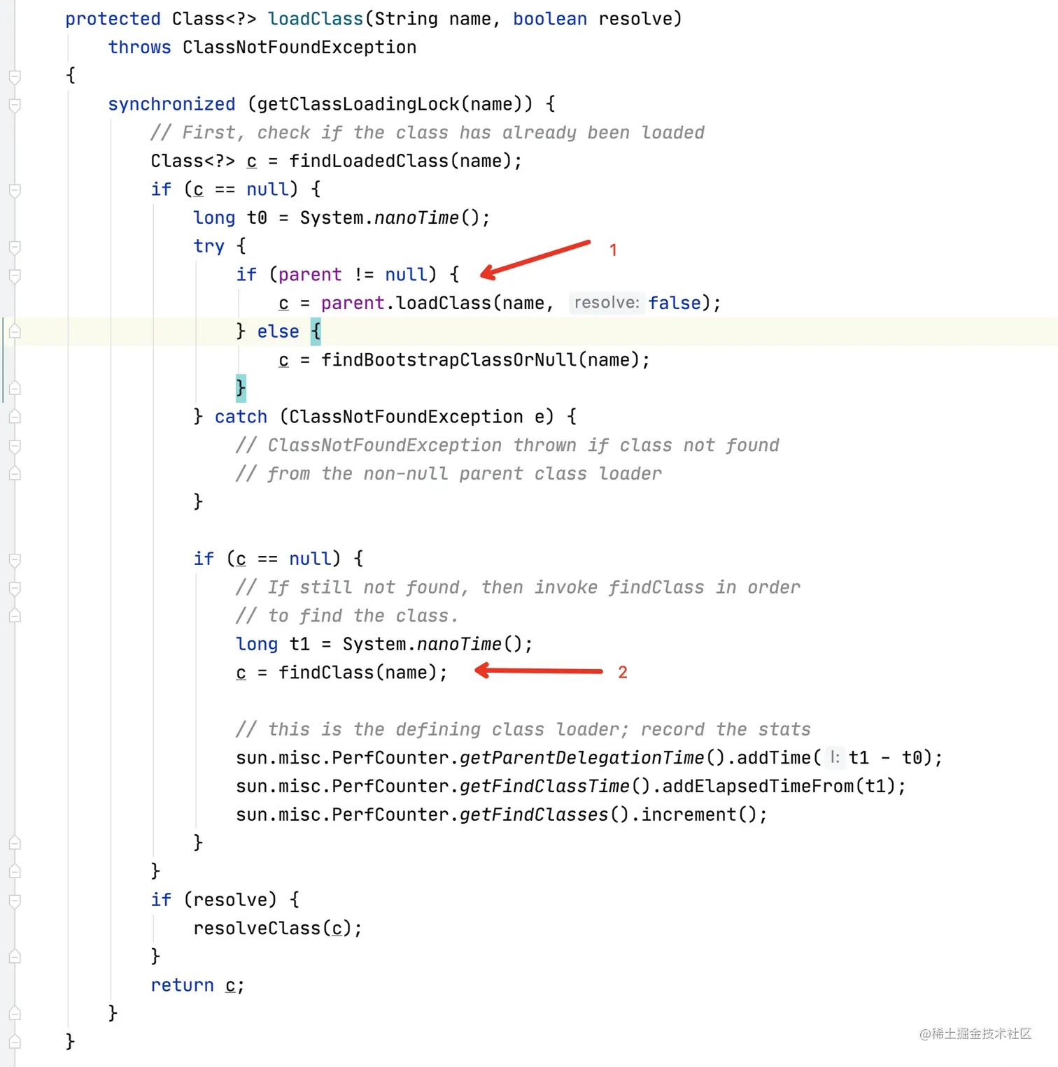2中才自己进行加载。因此我们一般实现findClass即可。而findClass是被loadClass调用的,loadClass已经保证了双亲委派机制。