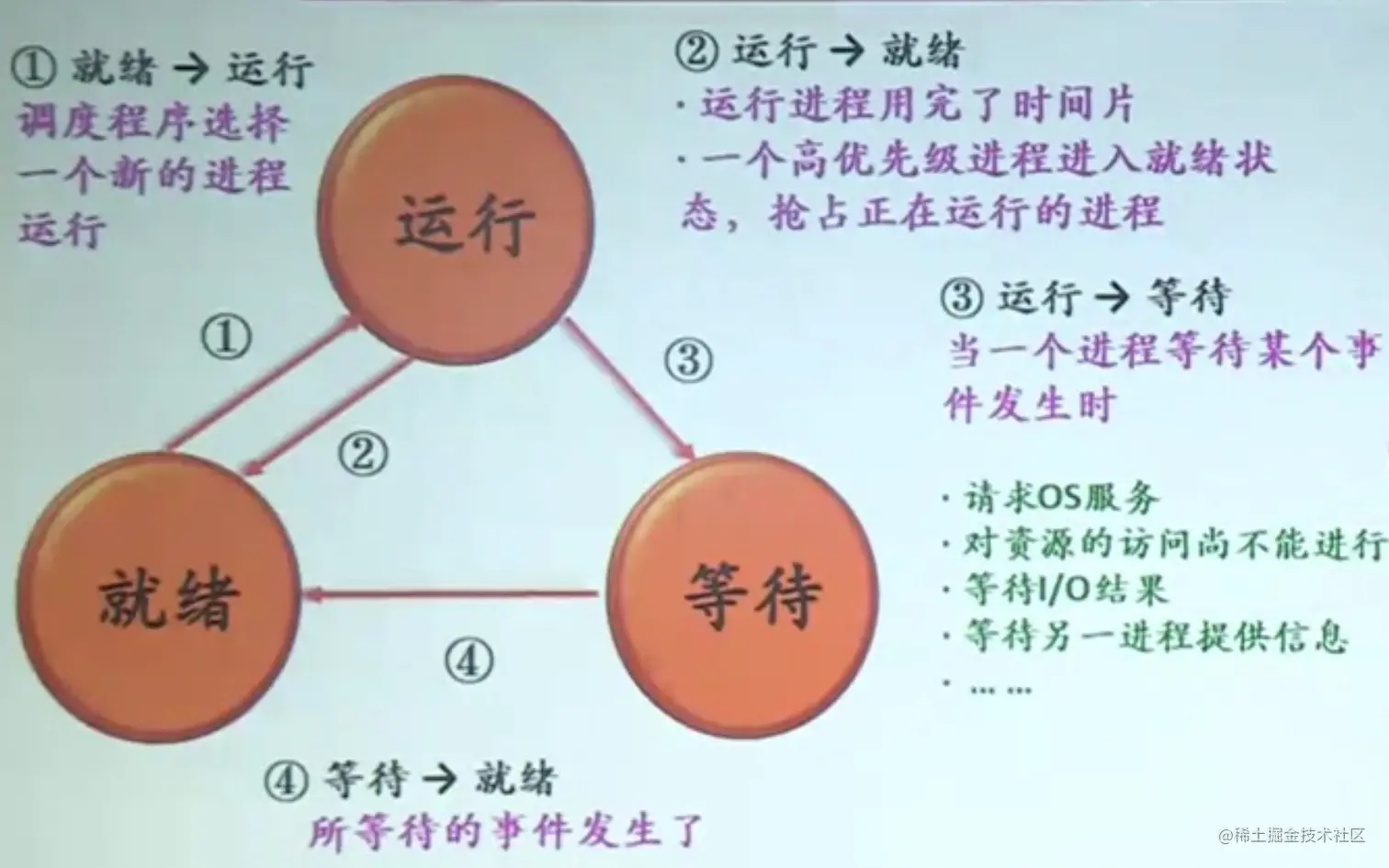 进程是正在执行程序的实例,进程产生是动态产生,动态消亡的,在其生命周期内,在三种基本状态之间转换