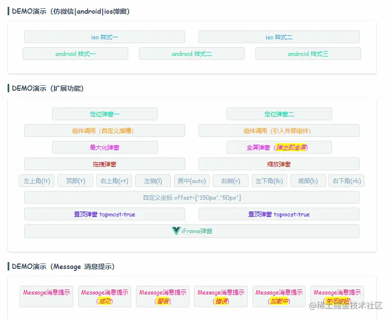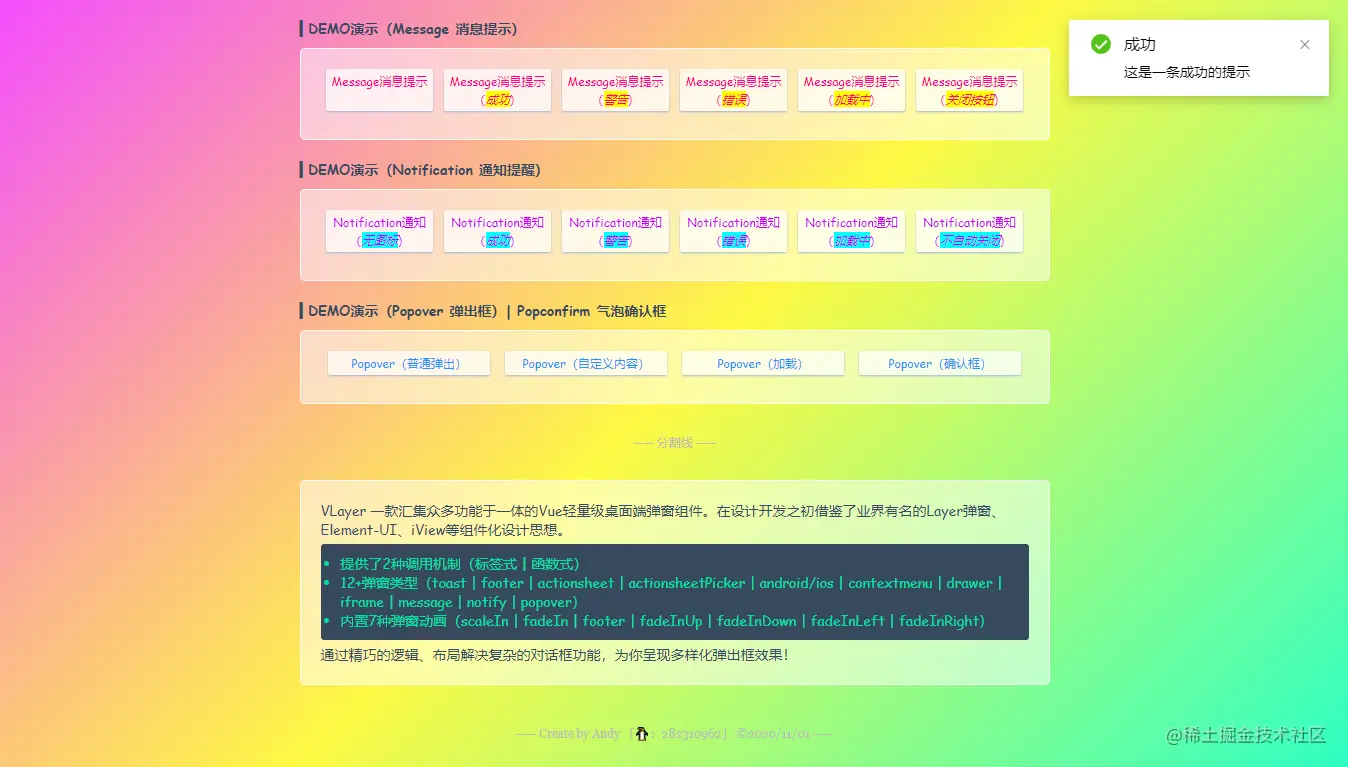 并且集合了Alert、Dialog、Message、Notification、ActionSheet、Toast、Popover、Popconfirm等多种类型弹窗。
