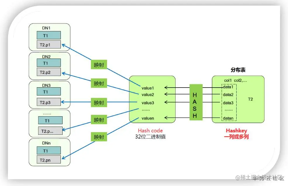 散列分布是按照某种散列规则,把表数据map到指定的数据节点(DataNode)上进行存储的方式。散列分布可以利用各个节点的IO资源,提升各个数据节点的IO能力。GaussDB(DWS)中采用hash的散列策略,按照表定义时指定的分布列组合,对一条记录的某一个或几个字段进行hash运算后,生成对应的hash值,然后根据DN实例与哈希值的映射关系获得该元组的目标存储位置。