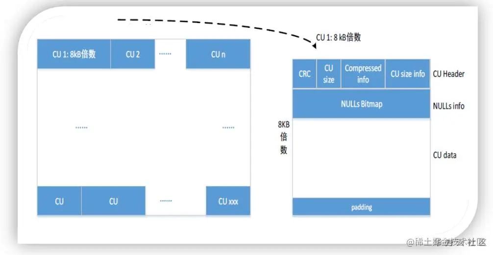 列存储下把数据表中的每一列单独存储,每个列的 6w条数据组成一个CU,每个列的所有的CU构成一个列的数据文件,每个列都会有单独的数据文件。CU的基本结构如下
