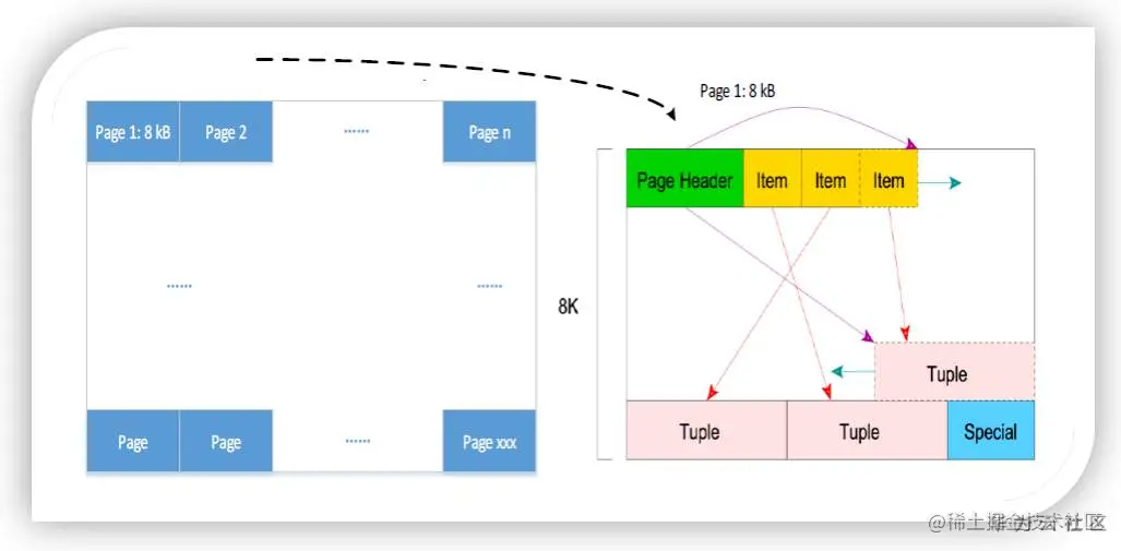 行存储模式下,一条数据的所有列组合在一起称之为一个tuple多个tuple组成一个page,所有的page构成表的数据文件。pages是行存数据存取的最小单元,一个page默认8KB。page的基本结构如下