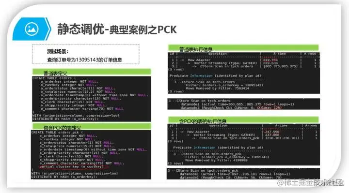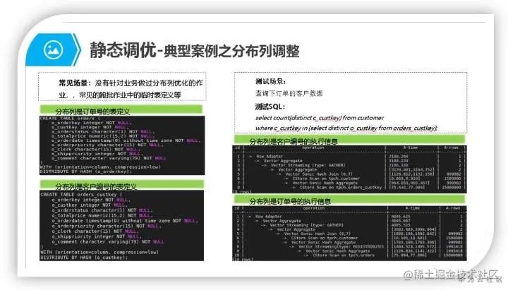 注意此策略主要适用于统计分析类的重查询场景,对于详单查询等以点查为主要场景的查询类业务,在满足前两个约束的前提下,可以优选存在常量等值Filter约束列作为分布列。因为这种场景在数据节点上使用索引加速查询,查询耗时往往以ms或者几十ms计,通过剪枝把查询任务map到具体的某个数据节点上执行,节省无效操作(不用连接到所有的数据节点上操作),同时也会大大的提高并发能力