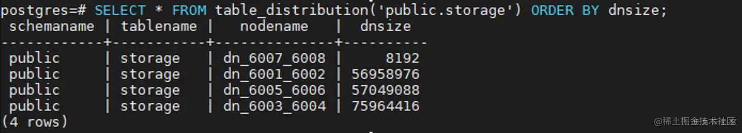 SELECT * FROM table_distribution('public.storage') ORDER BY dnsize;