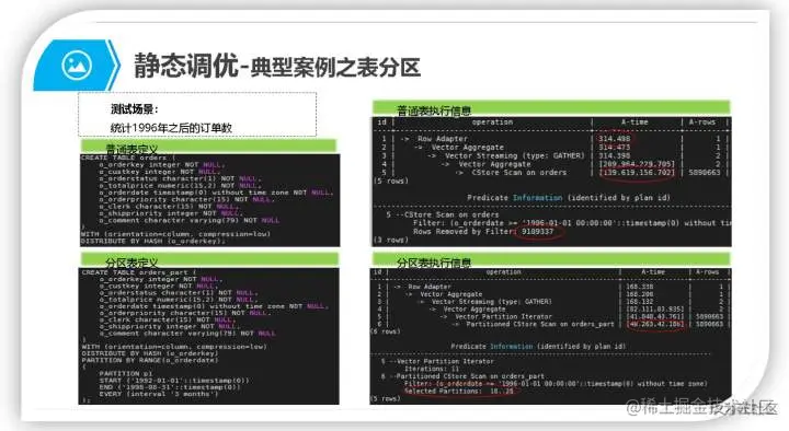 通俗的讲表,分区就是把一个大表按照条件分割为若干个小表,这种分割体现在数据库内部的数据管理上,对表数据的常规操作(UPDATE/DELETE/INSERT/SELECT)是透明的。一般对数据和查询都有明显区间段特征的表使用分区策略,可通过减少不必要的数据扫描提升查询性能。如下case中,使用分区表可以减少60%的数据扫描量,SQL查询整体性能提升46左右。