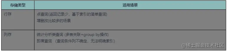 GaussDB(DWS)支持行存储(row-based storage)和列存储(column-based storage)两种存储方式,这两种存储格式分别适用不同的业务场景。通常来讲典型的点查询为主的场景推荐使用行存储,典型的统计分析型业务推荐使用列存储。