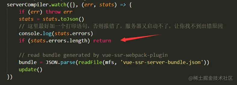 在 setup-dev-server.js 文件中有一行代码 if (stats.errors.length) return,如果有报错就直接返回,不执行后续的操作。导致服务器没任何反应,所以我们可以在这打一个 console.log 语句,打印报错信息。