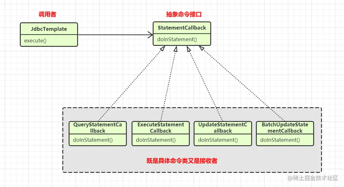 在JdbcTemplate中命令模式的使用并没有遵从标准的命令模式的使用,只是思想相同而已。