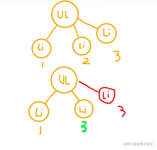 这也是vue的v-for为什么要加:key的原因,DOM diff时li为2的:key不存在了,就直接删除掉,再加载:key=3的li