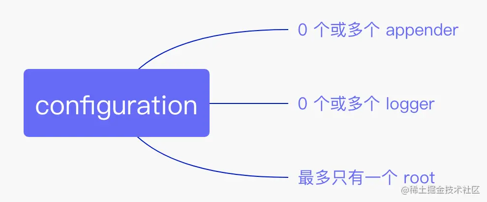 Logback 的配置文件非常灵活,最基本的结构为 <configuration> 元素,包含 0 或多个 <appender> 元素,其后跟 0 或多个 <logger> 元素,其后再跟最多只能存在一个的 <root> 元素。