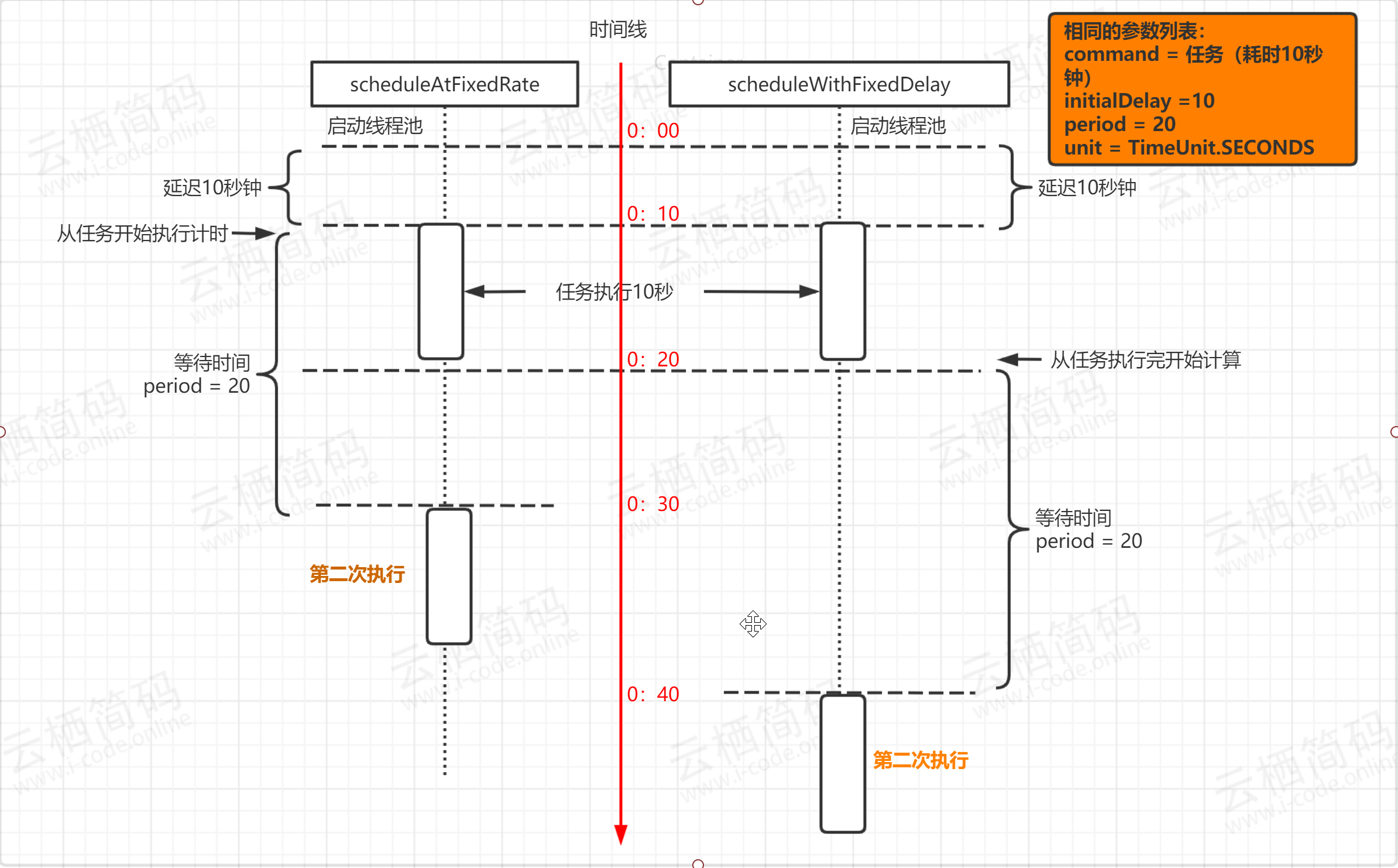 schedule, 它有三个参数,第一个参数是线程任务,第二个delay表示任务执行延迟时长,第三个unit表示延迟时间的单位,如上面代码所示就是延迟两秒后执行任务