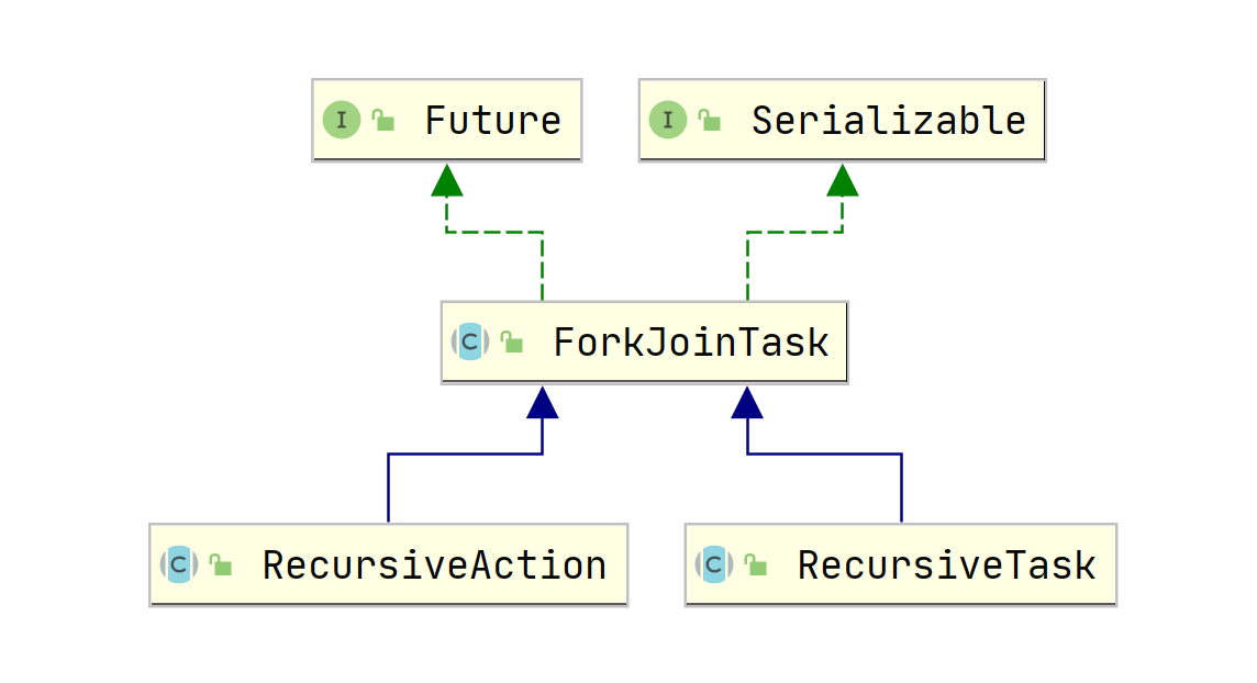 ForkJoinPool的使用也是通过调用submit(ForkJoinTask<T> task)或invoke(ForkJoinTask<T> task)方法来执行指定任务了。其中任务的类型是ForkJoinTask类,它代表的是一个可以合并的子任务,他本身是一个抽象类,同时还有两个常用的抽象子类RecursiveAction和RecursiveTask,其中RecursiveTask表示的是有返回值类型的任务,而RecursiveAction则表示无返回值的任务。下面是它们的类图: