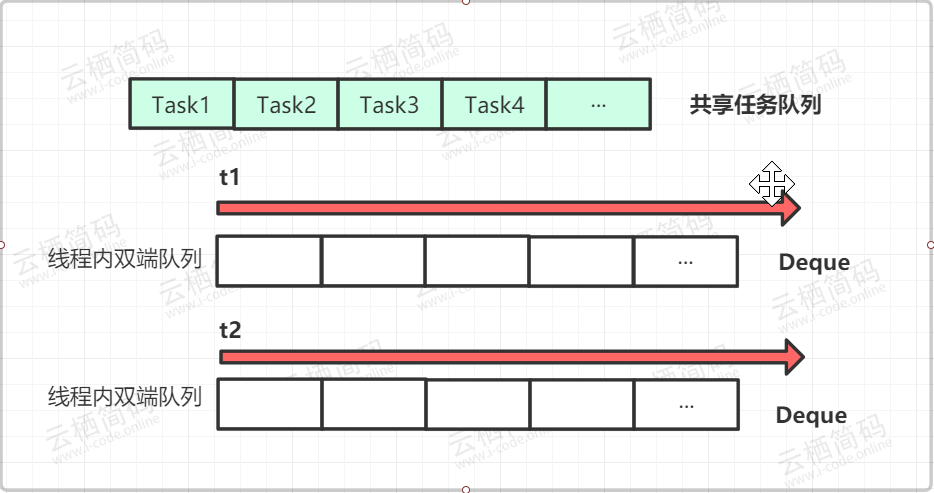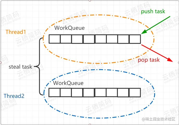 deque中,线程t1获取任务的逻辑是后进先出,也就是LIFO(Last In Frist Out),而线程t0在“steal”偷线程t1的deque中的任务的逻辑是先进先出,也就是FIFO(Fast In Frist Out),如图所示,图中很好的描述了两个线程使用双端队列分别获取任务的情景。你可以看到,使用 “work-stealing” 算法和双端队列很好地平衡了各线程的负载。