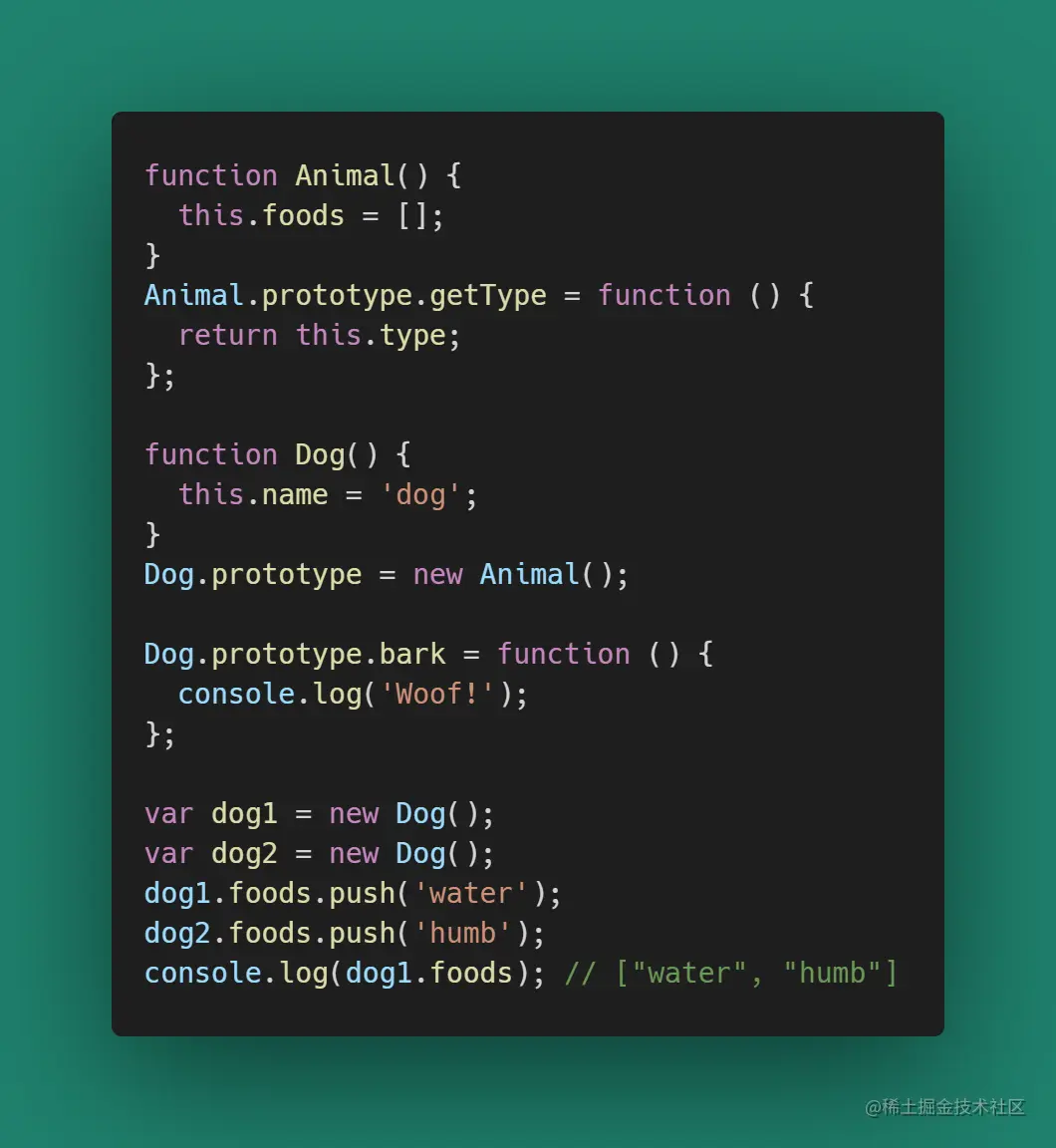 在这个🌰中Dog通过创建Animal的实例赋给Dog.prototype的方式来继承Animal