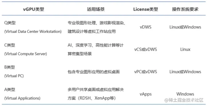 与物理GPU卡不同的是,NVIDIA vGPU面向不同的场景,提供四种类型产品。每种类型vGPU运行时需要相应的软件授权(License),对操作系统的要求也有所区别。