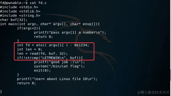 Atoi接收的参数我们可以控制,只要令argv[1]为0x1234(argv[0]为程序名称,argv[1]为输入参数),0x1234十进制为4660,经过运算最后赋值给fd的就是0,然后再传入read(),由于fd为0,所以我们在命令行中输入什么,则在buffer中写入的就是什么,只要输入LETMEWIN就可以了