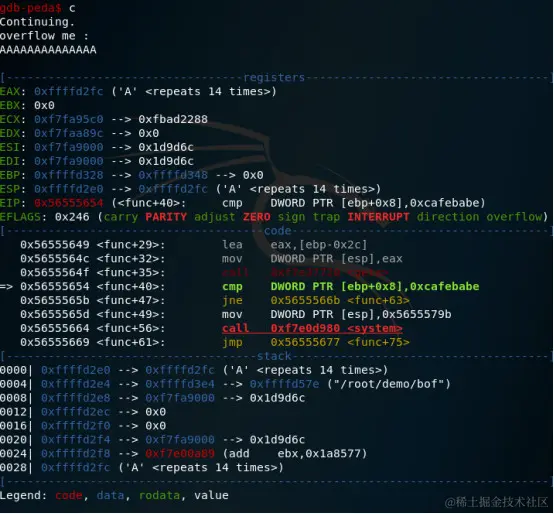 emmm,数一下,从最开始的0x41到0xdeadbeef之前查了13*4=52个字节,在53-56处写入0xcafebabe覆盖掉原有的0xdeadbeef即可